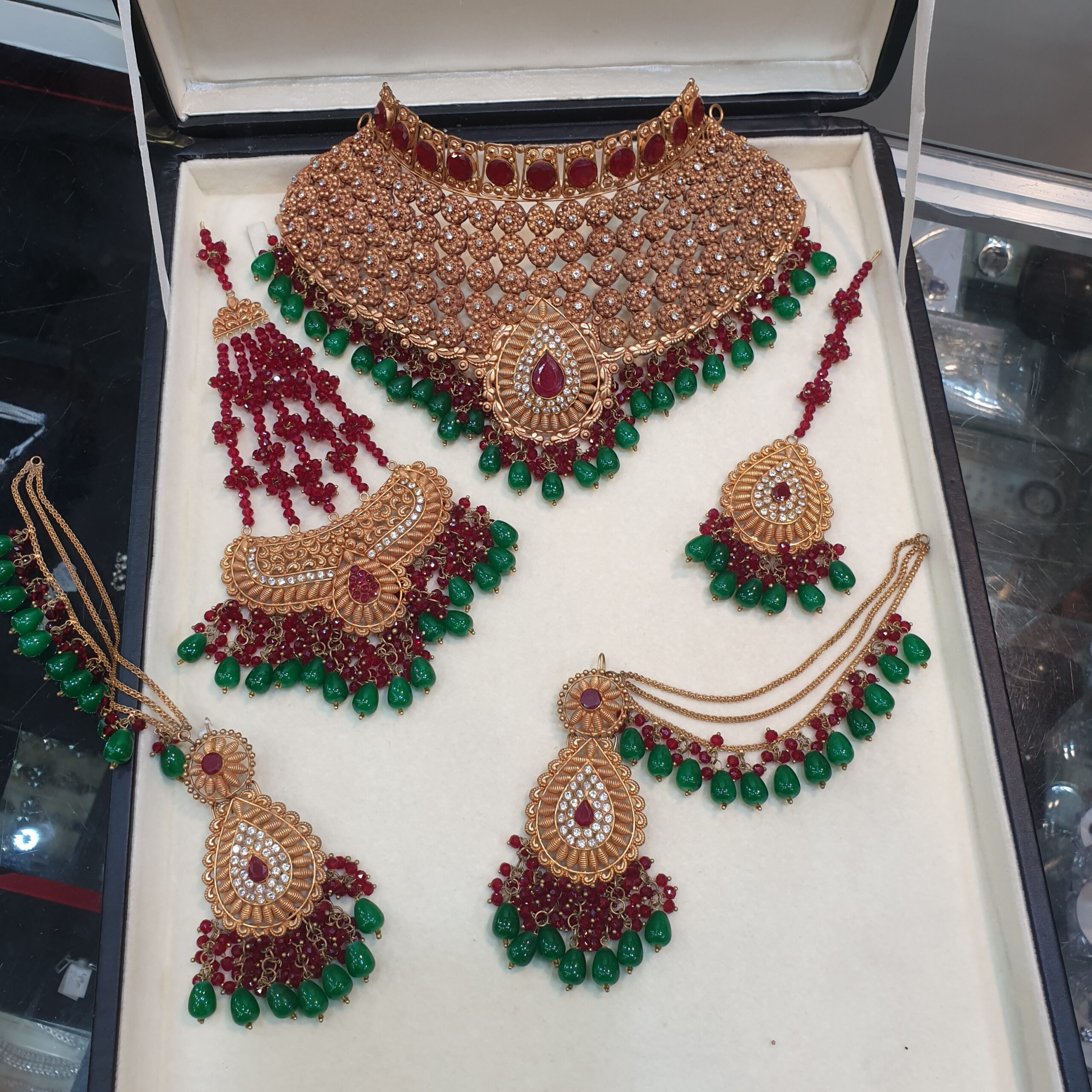 Make your bridal look unforgettable with our Heavy Bridal Collar Set, beautifully designed with multicolor moti (pearls) that add richness, elegance, and a vibrant touch to your special day. This statement collar set is crafted without a mala, giving it a bold, classy, and modern bridal appearance.
